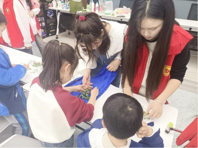 活动中,志愿者们首先向小朋友们介绍了关于植物的有趣知识、普及了植物拓染的起源、传承和艺术特点,详细地讲解了植物拓印的制作步骤及注意事项。随后,志愿者们带领小朋友们利用落花落叶等植物原材料,通过敲击来榨取汁液,在纤维材料上进行染色。小朋友们热情高涨,尽情发挥着自己的想象力,创造出了不同种类的拓印搭配形式,书写着生命的色彩。