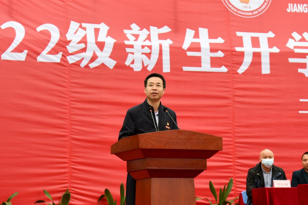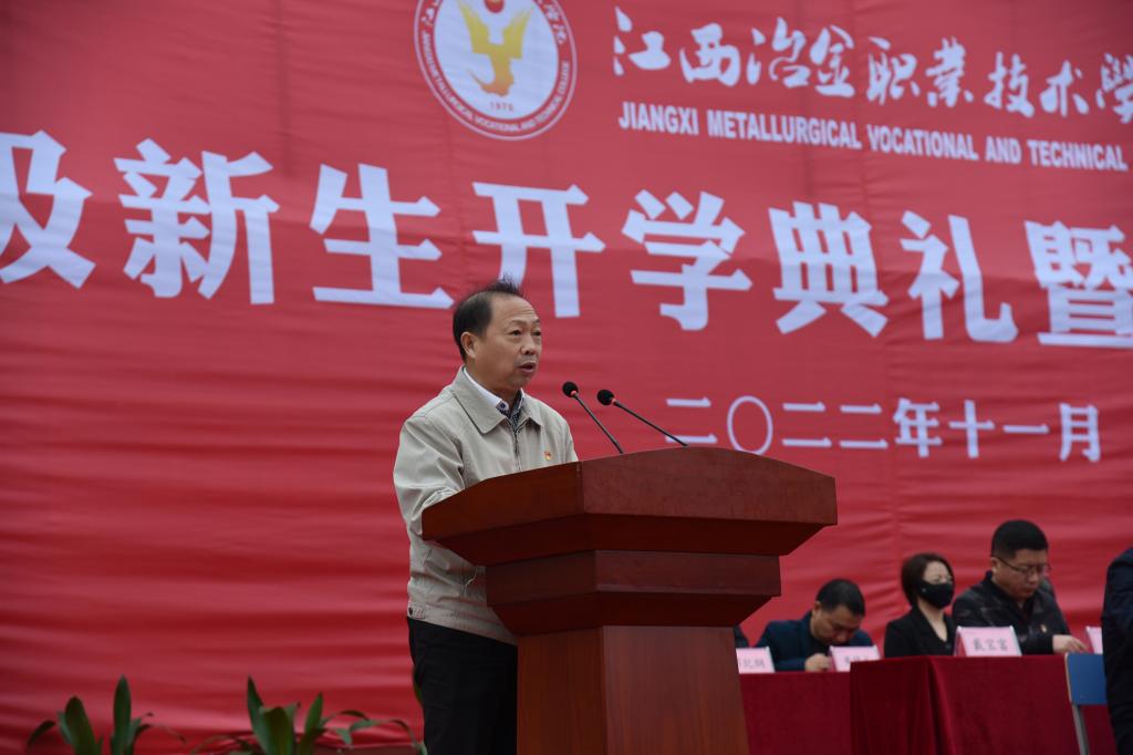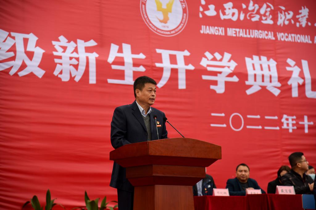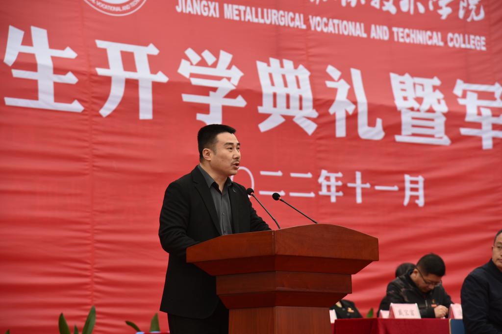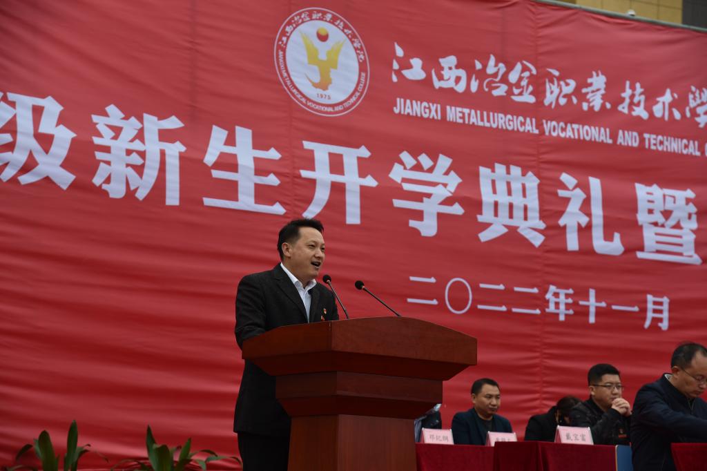 党委副书记、院长郭志江发表致辞。他向同学们提出两个问题:为什么选择江冶?在江冶如何度过?和同学们探讨了冶院发展的未来:随着办学实力的不断提升,冶院的录取分数线和社会评价越来越高,师资队伍、就业升学越来越好。在这样的环境中,同学们要珍惜时光,加倍努力。为此他向新生提出两点要求:一、希望立德修身。树立“爱党报国、敬业奉献、服务人民”的人生理想,成为建设社会主义现代化强国,实现中华民族伟大复兴的中坚力量。二、希望脚踏实地。在勤学苦练中提高本领、学会担当。