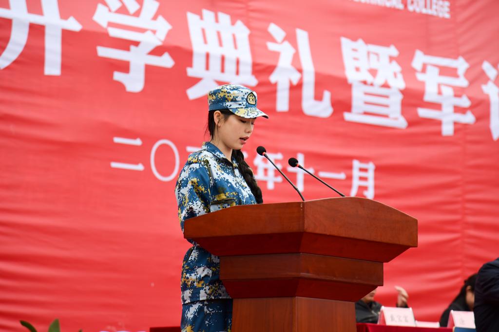 新生代表袁莉发言。她说,在军训中站军姿、踢正步,可以培养吃苦耐劳精神。“宝剑锋从磨砺出,梅花香自苦寒来”是我对军训最直接的体会。在未来的学习生活中,我要激励自己,把军训所学到的优良作风用到学习生活中去。