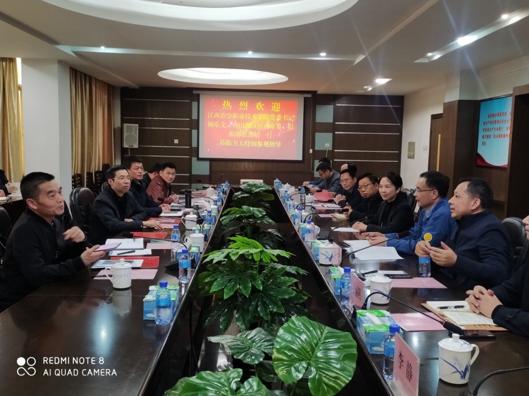 2023年3月3日,学校党委书记杨乐文、院长郭志江一行6人赴方大特钢,与南昌市青山湖区委常委、组织部长龚婧,方大特钢党委副书记、纪委书记、工会主席胡建忠等洽谈政校企合作,三方进行了亲切的交流与沟通。