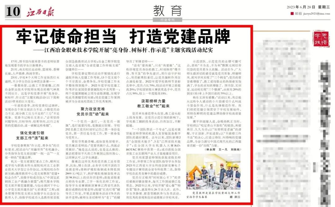 专题报道“牢记使命担当,打造党建品牌”在江西日报刊登