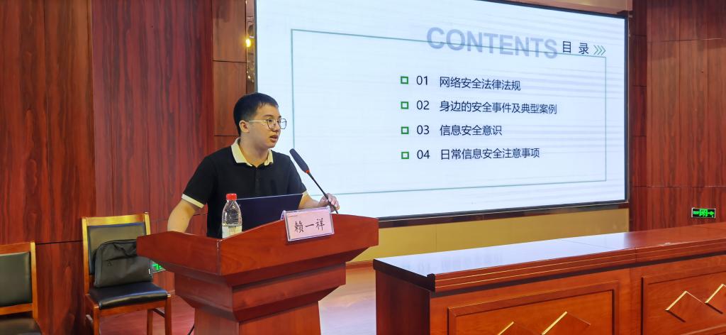 随后,赖一祥作题为“网络安全意识小课堂”专题讲座。他以国家网络安全宣传片为开场,从网络安全法律法规、身边安全事件及典型案例、信息安全意识和日常信息安全注意事项四大模块,用生动、幽默的语言和丰富的案例,传递网络安全法制建设理念,传授给同学们网络安全技能,让同学们清晰认识到网络安全的重要性,激励学生自觉维护网络安全,做新时代中国好网民的践行者,做网络文明建设的推动者。