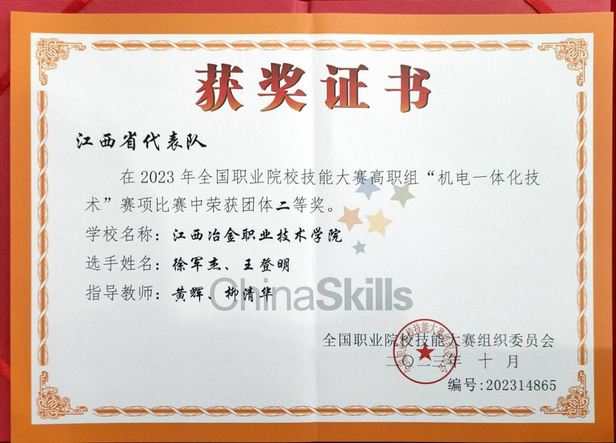 10月17日,2023年全国职业院校技能大赛高职组“机电一体化项目”赛项(高职组)在浙江机电职业技术学院圆满落下帷幕,经过二天激烈地角逐,我校电气工程学院21级机电一体化技术专业徐军杰同学、王登明同学在黄辉、柳清华两位老师指导下荣获团体二等奖的好成绩。