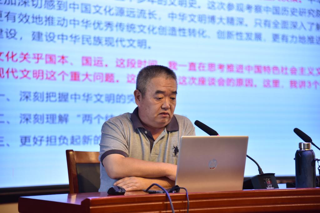 韩国华还结合学习习近平总书记在文化传承发展座谈会上的讲话精神,分享了深刻把握中华文明的突出特性,领悟中华文明突出连续性和突出统一性的认识体会:要厚植家国情怀,深怀历史意识,坚定国土不可分、国家不可乱、民族不可散、文明不可断的共同信念,更好的担负起新的文化使命。