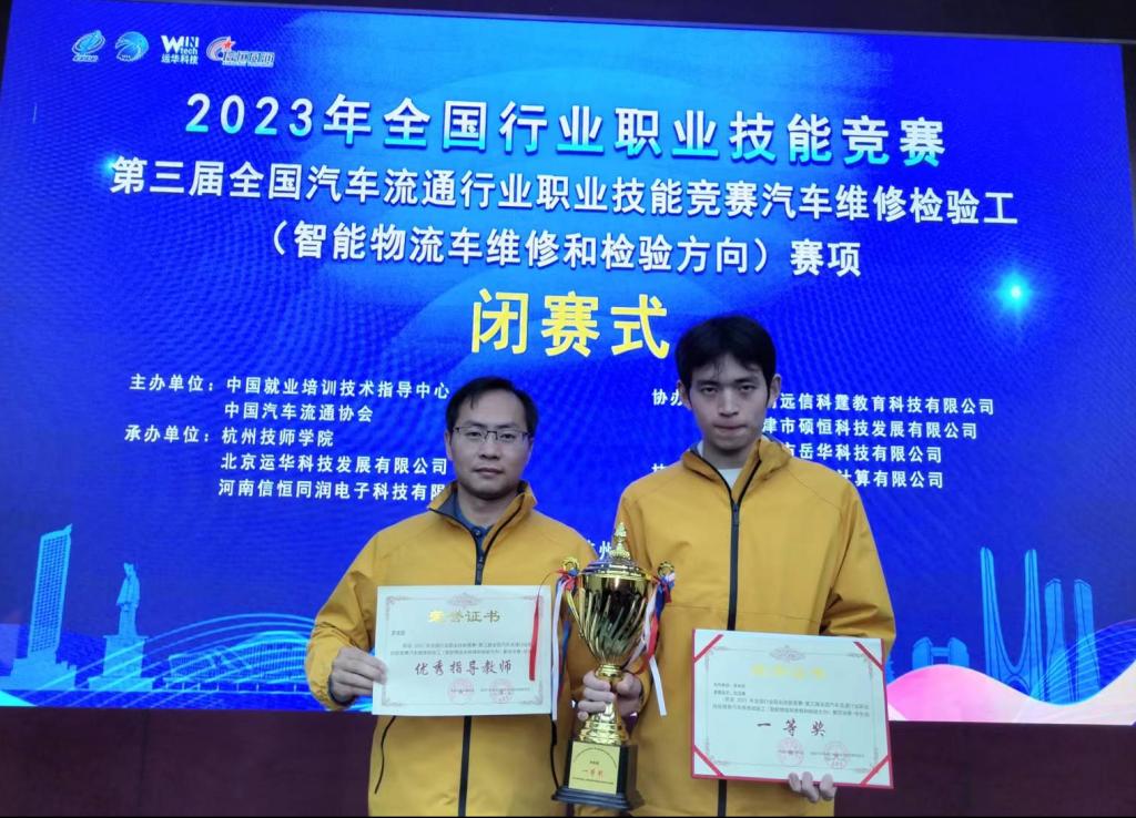 2023年11月27日,从杭州全国汽车流通行业职业技能竞赛汽车维修检验工(智能物流车维修和检验方向)赛项传来好消息,电气工程学院汽车技术运用工作室刘文峰同学喜获第一名。刘文峰同学的指导老师为罗良铨。