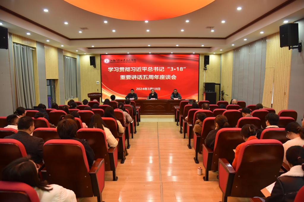 3月18日,学校在思政大讲堂召开学习贯彻习近平总书记“3·18”重要讲话精神五周年座谈会。党委副书记李茂旺出席并讲话,各党支部书记、相关部门负责人、全体思政课教师、各分院辅导员代表共80余人参会。座谈会由党委委员、党委宣传部部长孙毅主持。