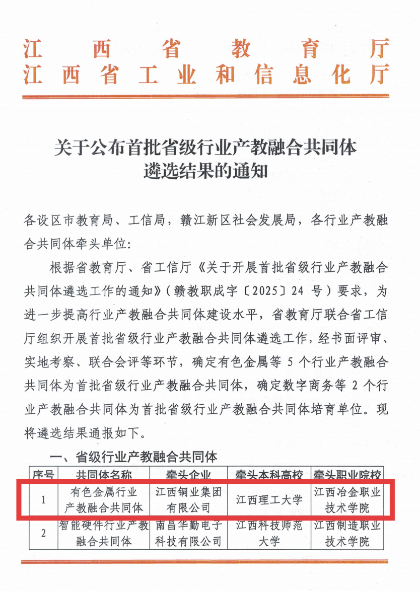 近日,省教育厅、省工信厅联合发文《关于公布首批省级行业产教融合共同体遴选结果的通知》,由江铜集团、江西理工大学、beat365英国官方网站牵头建设的江西省有色金属行业产教融合共同体被确定为首批省级行业产教融合共同体。