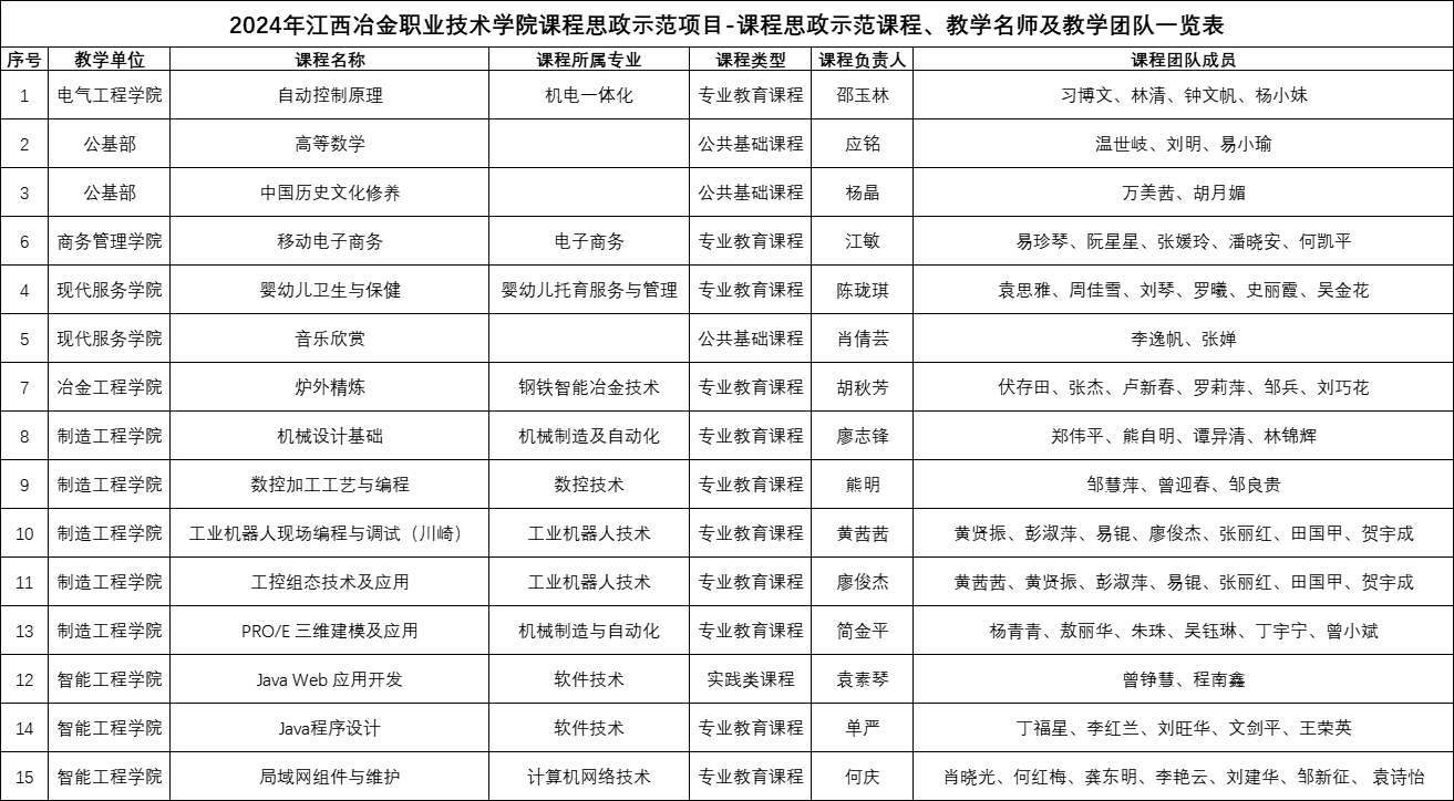 根据学校下发的《关于开展2024年课程思政示范项目建设工作的通知》(赣冶院教字〔2024〕16号)文件要求,经过各教学单位组织教师自愿申报,分院初审,教务处组织校外专家进行评审和学校复议,拟确定《汽车电工电子》等27个案例为课程思政优秀案例,《自动控制原理》等15门课程为校级课程思政示范课程,邵玉林等15名教师为校级课程思政教学名师,《移动电子商务》江敏教学团队等15个团队为校级课程思政示范教学团队。现进行公示。