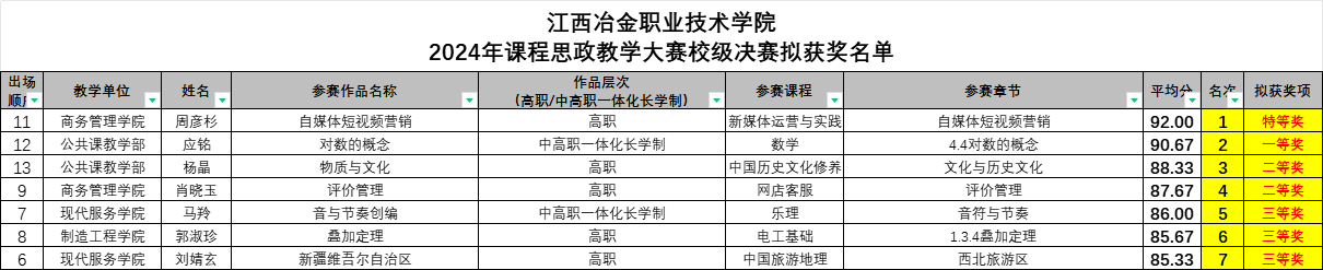 根据学校《关于开展beat365英国官方网站2024年课程思政教学大赛的通知》文件要求,经评委专家现场评审和综合评议,2024年学校课程思政教学大赛拟评出特等奖1名、一等奖1名、二等奖2名、三等奖3名(名单见附件)。现予以公示,公示期为2024年12月6日至12月8日。公示期内,如对获奖结果有异议,请于12月8日前向纪委办公室或教务处办公室反映。