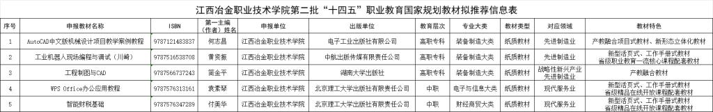 根据省教育厅《关于做好第二批“十四五”职业教育国家规划教材申报工作的通知》(赣教职成办函〔2025〕4号)文件要求,经过各分院教师自愿申报,分院和教务处初审,校内专家进行评审和学校复议,拟推荐《AutoCAD中文版机械设计项目教学案例教程》《工业机器人现场编程与调试(川崎)》等5本教材代表学校申报第二批“十四五”职业教育国家规划教材。现进行公示。