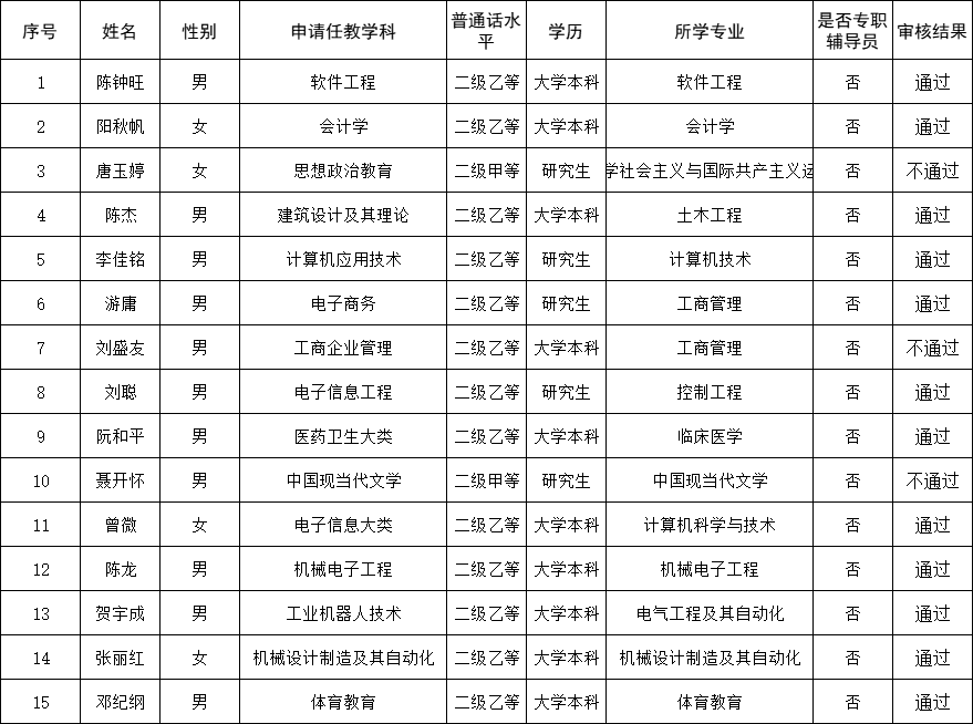 根据《关于做好2025年上半年全省普通高等专科学校和成人高等学校教师资格认定工作的通知》(赣教资函〔2025〕1号)文件精神,经个人网上申报、教育教学基本素质和能力测试、体检、现场确认等环节,共有陈钟旺等15位教师申请,根据认定相关要求进行审核,12位教师符合申报认定资格,3人不符合,现予公示(名单公告如下):
