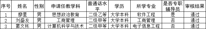 根据《关于做好2025年下半年全省普通高等专科学校和成人高等学校教师资格认定工作的通知》(赣教资函〔2025〕3号)文件精神,经个人网上申报、教育教学基本素质和能力测试、体检、现场确认等环节,共有廖星等3位教师申请,根据认定相关要求进行审核,3位教师均符合申报认定资格,现予公示(名单公告如下):