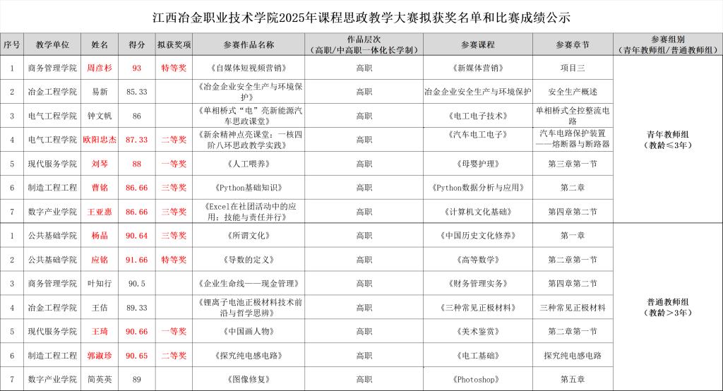 根据学校《关于举办beat365英国官方网站2025年课程思政教学大赛的通知》文件要求,经评委专家现场评审和综合评议,2025年学校课程思政教学大赛拟评出特等奖2名、一等奖2名、二等奖2名、三等奖3名(名单见附件)。现予以公示,公示期为2025年11月27日至11月29日。公示期内,如对获奖结果有异议,请于11月29日前向纪委办公室或教务处办公室反映。