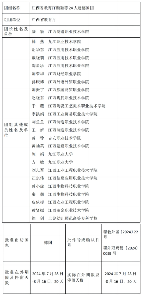 根据省教育厅《关于组织实施第二轮“江西省职业院校高水平教师教学创新团队出国(境)研修计划”的通知》(赣教外函〔2024〕22号)文件精神,我校教师黄贤振于2024年7月28日-8月16日赴德国参加由省教育厅举办的“数字化技术及其在智能制造专业中的应用‘双师型’教师赴德研修班”。按照上级相关规定,现就团组此次出访回国信息予以公示: