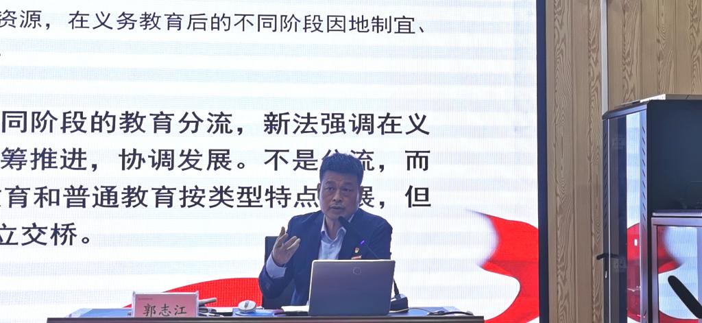 郭志江结合学院日前接受省国资委年度办学水平综合考核反馈情况,对新修订的《中华人民共和国职业教育法》的内容、意义和亮点进行了重点讲解,旁征博引、触类旁通、案例生动、令人鼓舞。在谈到学校将如何贯彻《职业教育法》时,他提出要加强“红色引领,成长指导,素养训练,项目实践、星级激励”,尤其要在“岗课赛证”综合育人、长学制一体化、校企深度融合中国特色学徒制方面下工夫,令全体学员受益匪浅,深受启发。