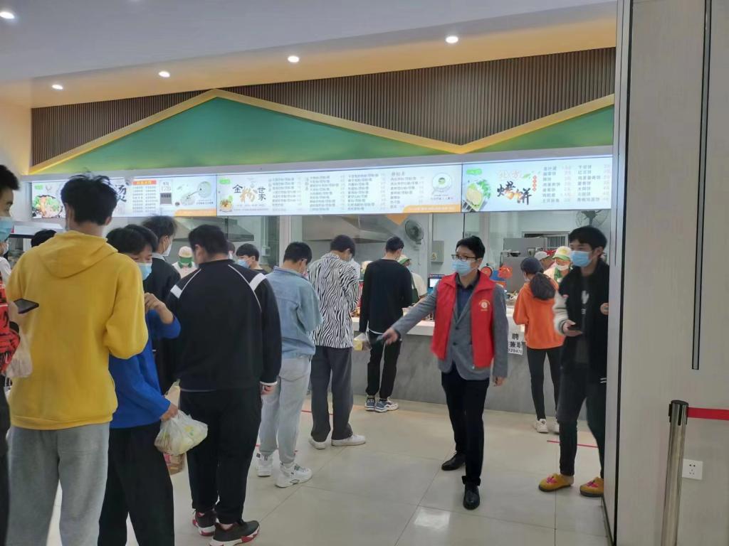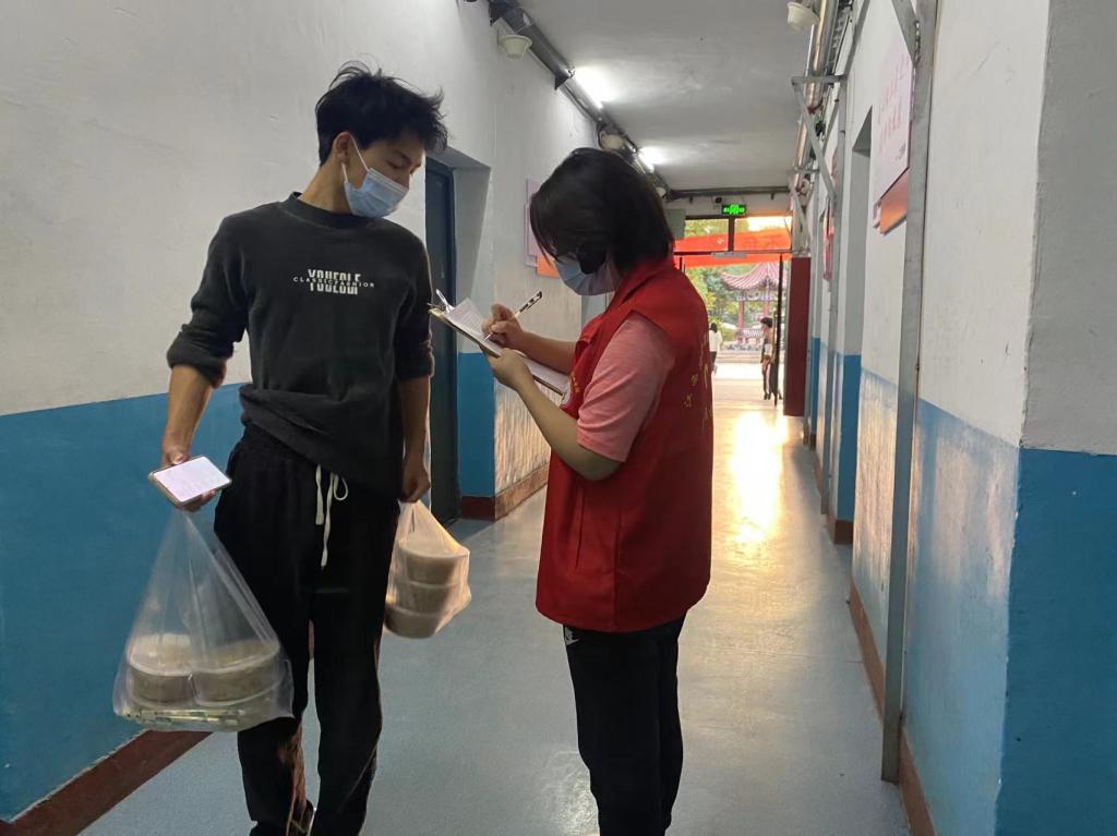 组织学生有序取餐——图片故事:每天中午,学工处管理人员、各栋栋长、志愿者各司其职,对每栋楼逐层逐一安排寝室代表外出取餐,同时维持“一米线”秩序。