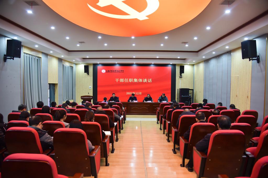 2023年12月29日,学校在思政大讲堂召开新任职中层干部集体谈话会。学校党委书记杨乐文,党委副书记李茂旺,党委委员、纪委书记谢向莹出席会议,年度新任职的中层干部参加谈话会,会议由党委委员、组织部部长曹春宜主持。