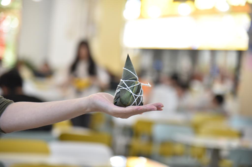 在知行餐厅食堂一楼,大家齐聚一堂。食堂阿姨早早准备好了包粽子所需的糯米、粽叶、线、红枣、鲜肉等材料。有经验的阿姨耐心地传授包粽子的技巧,老师和学生们拿起粽叶,学做漏斗,装糯米,加馅料。大家一边包裹,一边交流怎样包出自己满意的粽子。现场粽叶飘香,气氛融洽,欢声笑语不断。