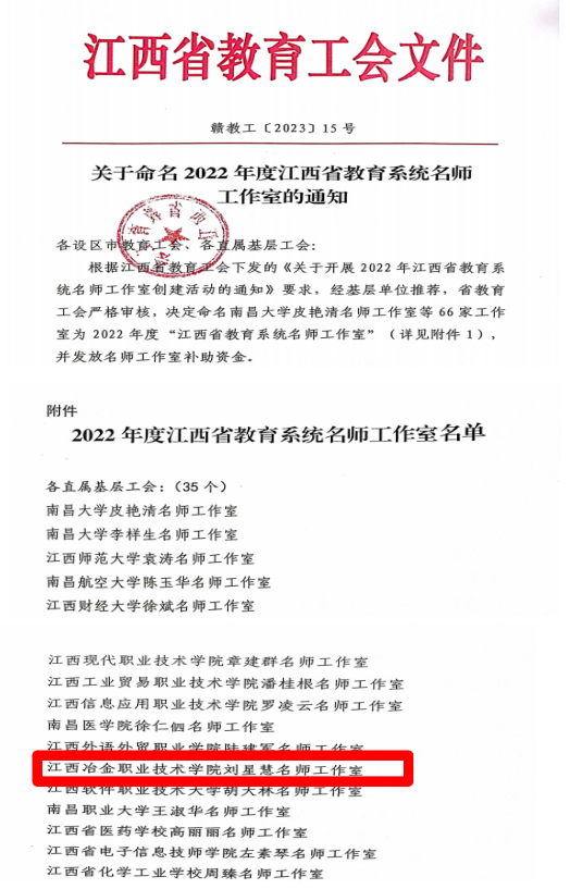 日前,江西省教育工会公布2022年度“江西省教育系统名师工作室”名单,我校“刘星慧名师工作室”获批命名。