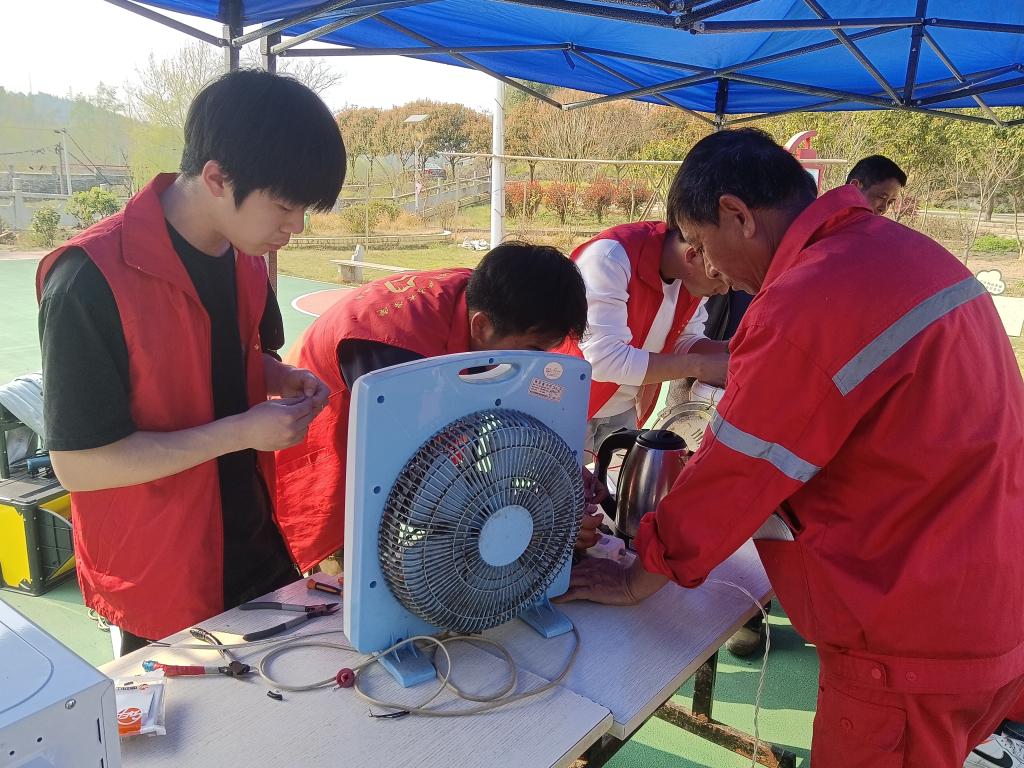 电气工程学院志愿者在当地的一个党群服务中心旁搭建了一个维修点。村民们听闻有志愿者来村里维修电器,都纷纷拿了一些坏了的电器过来修。志愿者们热情的帮他们维修,利用自己平时所学的专业技术耐心地帮村民们修好了电风扇、甩水机、热水壶、暖手炉等等,其中一个志愿者还将自己焊接好的三个不锈钢鞋架送给了村民,村民们都围在旁边赞扬志愿者,感谢志愿者的贴心服务,此时的志愿者们汗流浃背,但脸上洋溢着开心的笑容。