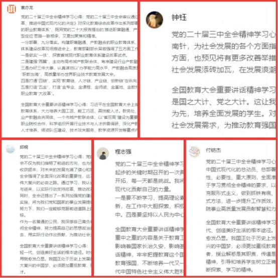 会后,学习小组成员在网上交流学习心得体会。大家一致认为,党的二十届三中全会明确了以中国式现代化全面推进强国建设、民族复兴伟业的具体目标任务;习近平总书记在全国教育大会上的重要讲话,让我们感受到了习近平总书记对教师的期望和关怀,大家将以更高的责任感和使命感,投身学校职业教育事业高质量发展的热潮之中。