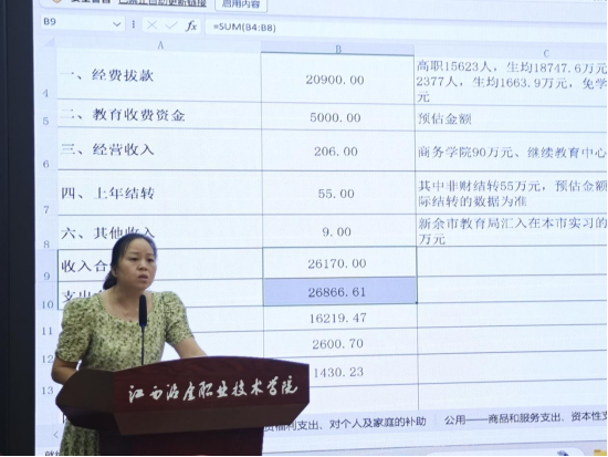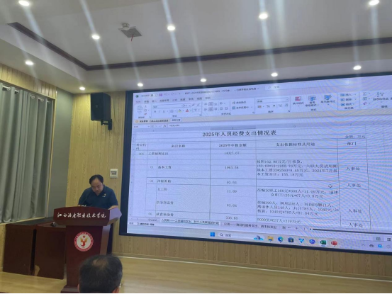 计划财务处处长周琼汇报了2025年度学校预算编制的总体情况,包括预算收入,人员经费支出、公用经费支出、刚性项目支出以及实训室、信息系统、基础设施支出等预算支出情况。