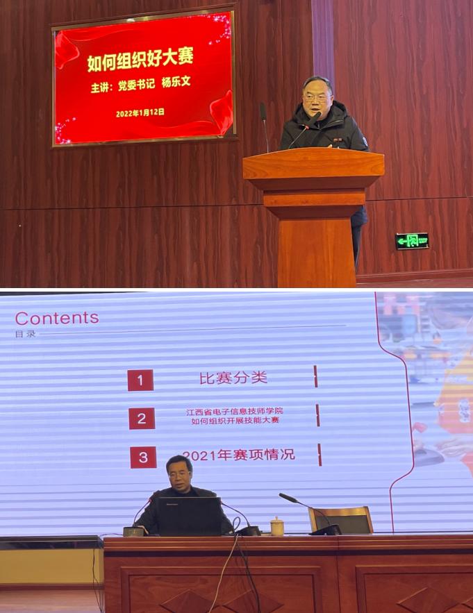 当天下午,学院党委书记杨乐文就如何组织大赛作专题讲座。杨书记从比赛分类、兄弟院校如何组织开展技能大赛和2021年赛项情况三个方面作了系统全面、深入浅出的讲解。杨书记提出“四个覆盖,四个延伸”的工作要求,即覆盖所有专业(工种),覆盖所有老师,覆盖所有学生,覆盖所有核心素养;由学生竞赛向教师竞赛延,由单一技能竞赛向能力素质类竞赛延伸,由教学活动向全面育人活动延伸,由看到成绩向发展问题延伸。杨书记独到的职教理念得到了与会老师们的高度认同。
