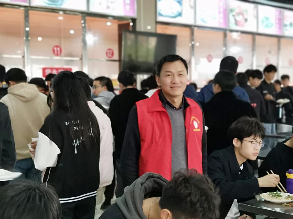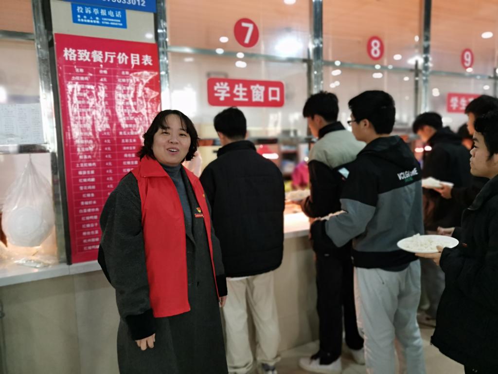 机关第二党支部书记董洁与支部委员付钫杰,带领何志昌、周琼、丁宇宁等党员在食堂窗口维护购餐秩序;支部委员袁亦龙与党员欧阳自英在用餐区,对浪费粮食的师生进行“光盘引导”;阮红萍与曲列波在餐盘回收区指导垃圾分类并监督师生分类归还餐具。