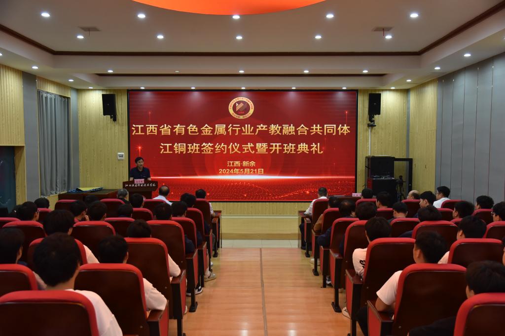 5月21日下午,学校与江西铜业集团有限公司现代学徒制人才培养合作签约仪式暨开班典礼在新二实训楼思政大讲堂隆重举行。江西铜业股份有限公司机关党委书记、党委组织部副部长卢章师,学校党委书记杨乐文、副书记李茂旺、副院长彭全出席,江铜集团企业导师、分院负责人、教务处、现代学徒制江铜班学生(学徒)等近百余人参加。签约仪式由教务处处长何志昌主持。