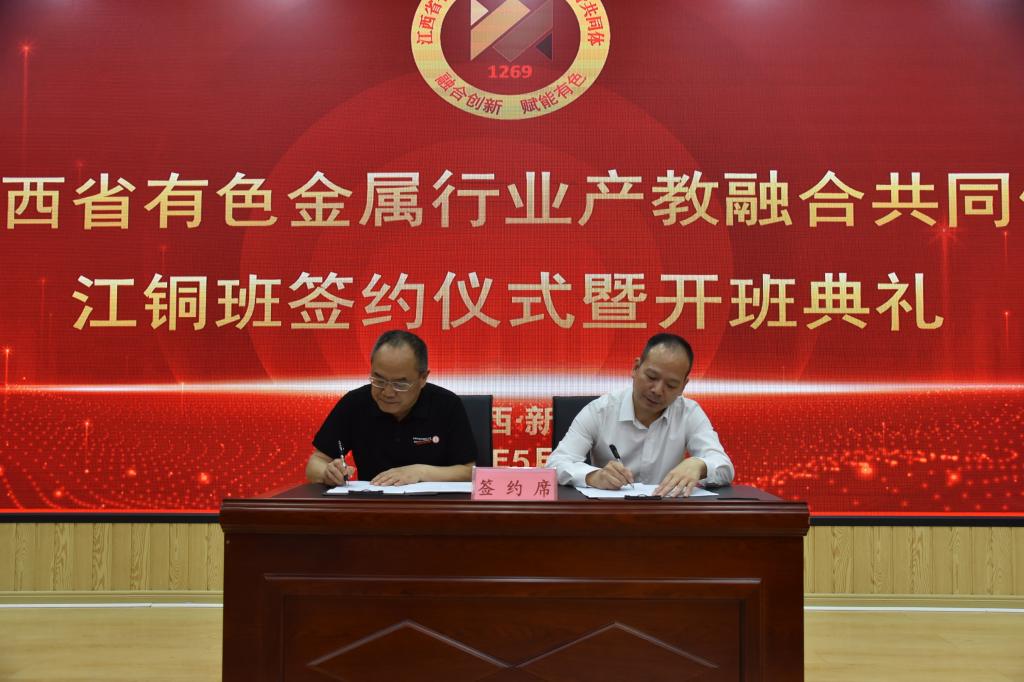 随后,学院党委委员、副院长彭全和江西铜业股份有限公司机关党委书记、党委组织部副部长卢章师郑重签署了2023级现代学徒制人才培养合作协议。