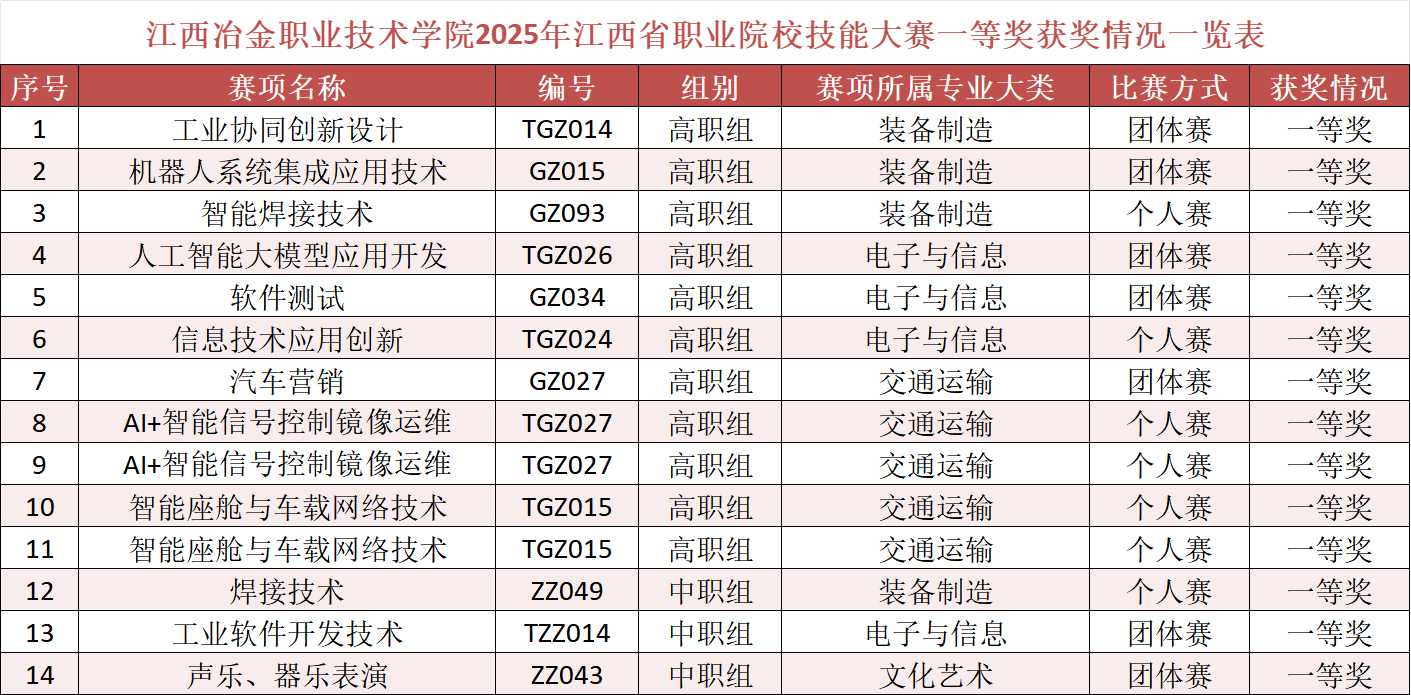 日前,在刚结束的2025年江西省职业院校技能大赛中,学校参赛师生奋勇拼搏,共取得14项一等奖、21项二等奖、42项三等奖的骄人成绩,一等奖比去年多了5项,获奖总数比去年多了11项,创历史新高。这份亮眼的答卷,彰显了学校在职业教育领域的育人成效。