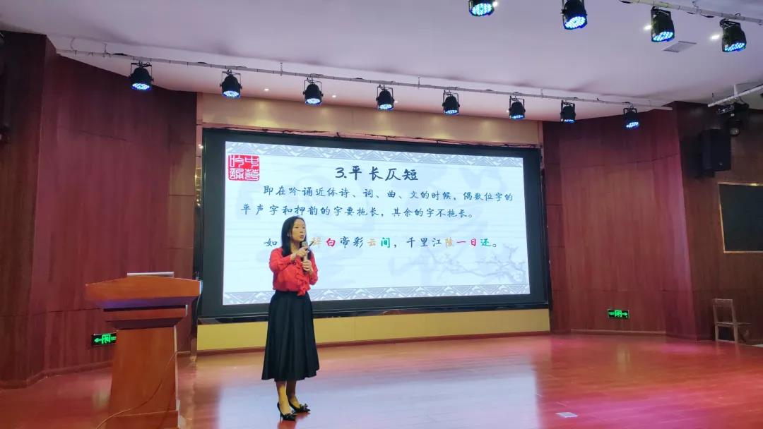 活动中,陈老师从吟诵历史、吟诵作用等方面进行了阐述,重点介绍了“一本九法”的吟诵规则,对“依字行腔、依义行调、入短韵长、平长仄短、平低仄高”等吟诵方法一一进行详尽解读。