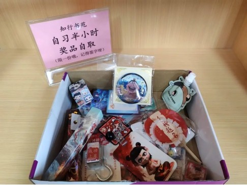 知行书苑开张伊始,图书馆档案管理中心组织开展了自习半小时奖励活动。在此读书自习的同学有机会领取精美奖品一份。奖品丰富多样,有盲盒、哪吒周边挂件、便签本、护手霜、糖果等,可爱又实用。