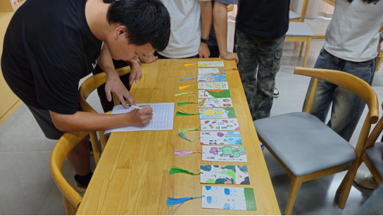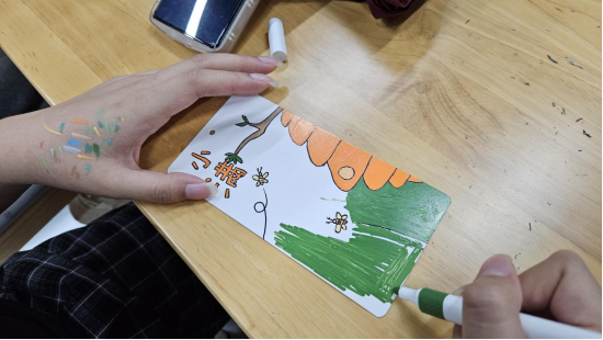 在创作环节,同学们围绕主题,用画笔将节气特色融入书签设计,有人绘就“小满麦渐饱满” 的田园风光,有人描 “霜降木叶丹” 的自然图景,创意迭出,把诗词中的意境化为具象。