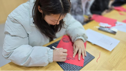 随后剪纸环节便热烈展开。同学们兴致高涨,手持红纸、剪刀、刻刀等工具,纷纷化身为“非遗手艺人”。现场虽安静却充满活力,有的同学仔细勾勒轮廓,有的专注裁剪细节,大家在动手实践中感受着中华优秀传统文化的魅力。