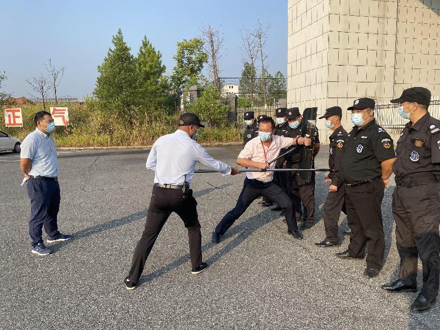 黄平文详细讲解了钢叉、盾牌、橡胶棍等防护器材的正确使用方法,并进行操作演示。随后,模拟校外人员持械闯入校园,学院安保人员进行快速处置的实战演练。