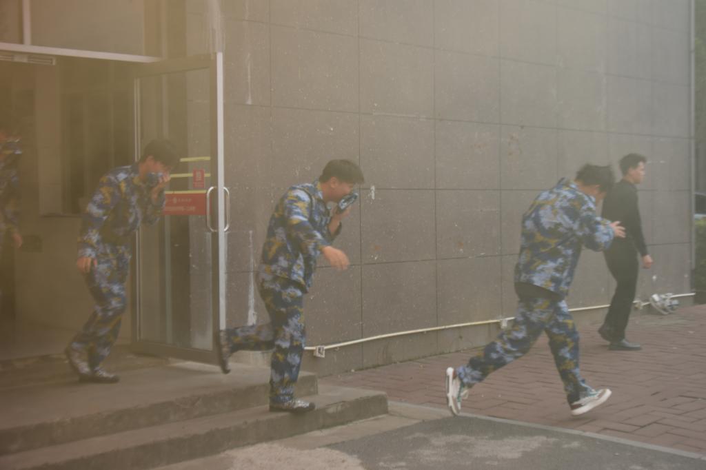 随后,在第三教学大楼和6栋、7栋学生宿舍,同学们进行了消防安全应急疏散演练。上午10点20分,校内警报响起,应急疏散演练指挥部下达了“宿舍楼发生火灾,请同学们立即撤离”的命令。保卫处工作人员、消防员、各班老师迅速引导学生,沿着指定的安全疏散路线快速有序地撤离。同学们弯着腰,用帽子捂住口鼻,井然有序地快速撤离到田径场。