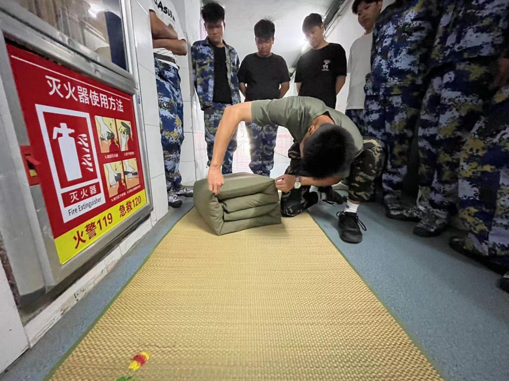 宿舍里,教官带领学生学习整理内务,叠军被。