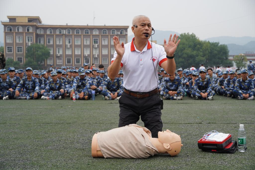 在现场模拟练习环节中,老师们悉心指导,及时纠正动作;同学们利用人体模型进行现场心肺复苏和AED操作演练,认真听讲、积极互动、反复练习。现场学习氛围活跃,同学们纷纷表示:学校的军训安排得内容丰富,形式多样,非常有趣。