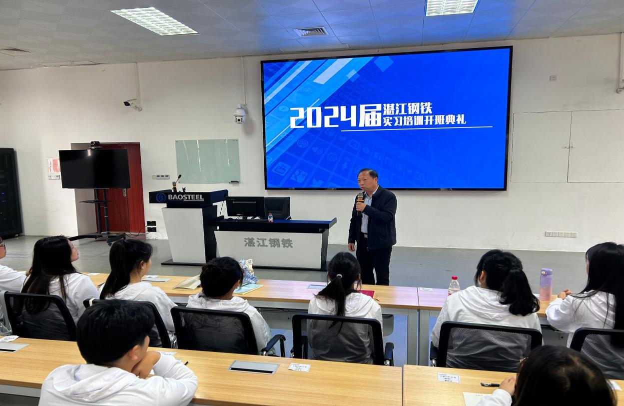 在湛江钢铁举办的开班典礼上,李茂旺讲话。他代表学校,向离校来到企业新入职的同学们表示慰问,提醒同学们在实习中要注意安全;要严格遵守企业规章制度,适应环境变化,安心工作;要把握实习机会,努力锻炼成长,尽快实现好学生到合格工人的身份转换,融入宝武大家庭。