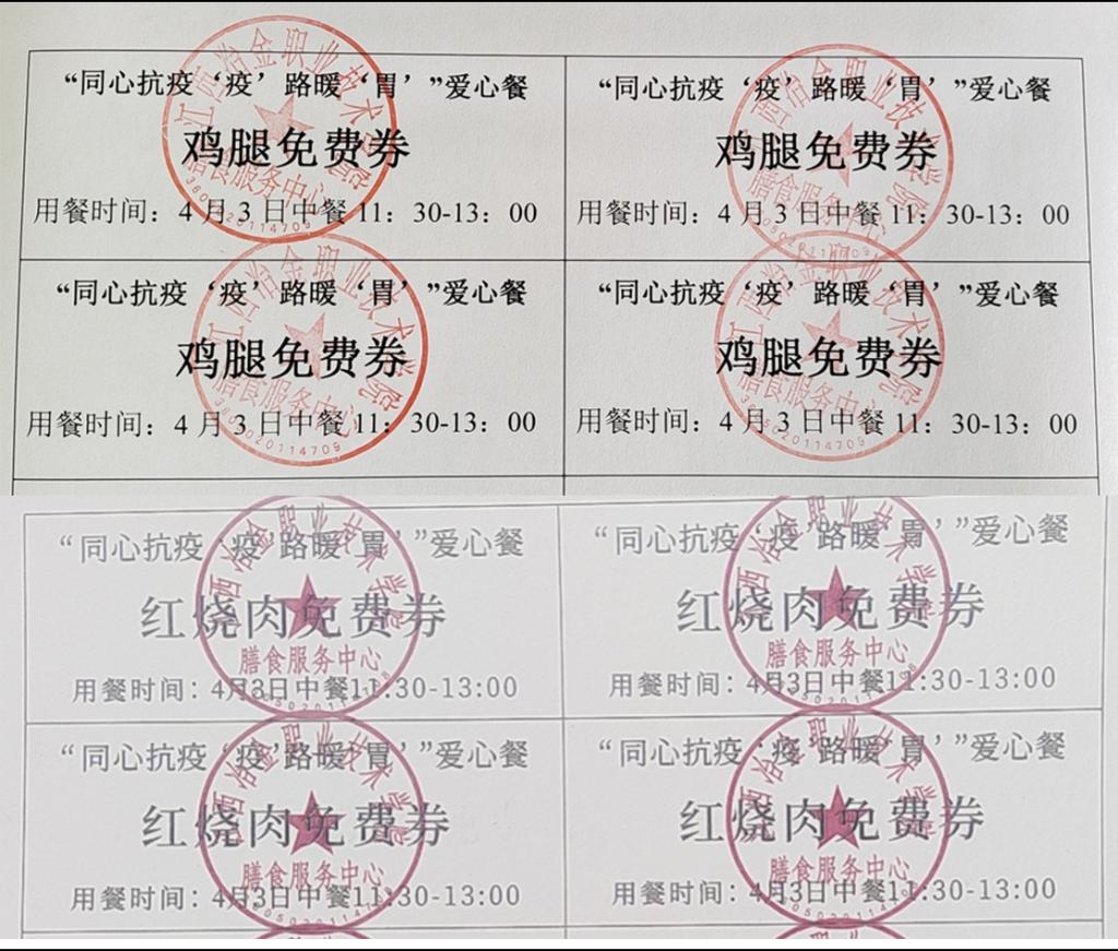 据了解,为缓解学生在疫情期间的浮躁情绪,体现学院人文关怀,积极发挥服务育人功能,助力学院疫情防控工作,共同筑起抗疫屏障,膳食服务中心根据在校师生人数每人发放爱心免费餐券两张,师生可凭餐券到任一食堂免费领取爱心菜品一份。该活动时间为4月2日、3日两天中午。