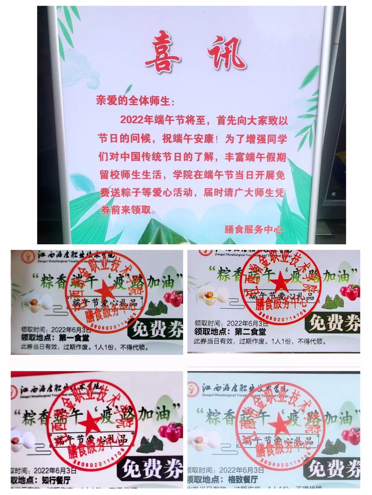 一走进食堂,同学们的注意力就被门口竖着的海报吸引了,这是一张“膳食服务中心全体员工祝全校师生端午节安康”的海报,上面还附有“同学凭餐券免费领取粽子”的温馨提示。