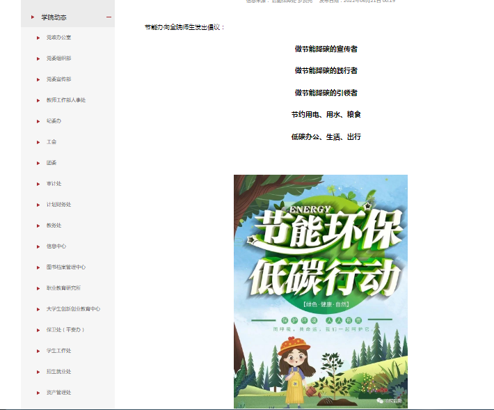 ①开展主题宣传活动。学院各部门采用线上和线下同时推进的方式组织节能宣传周活动,通过宣传标语、微信公众号、电子屏幕等方式进行宣传。