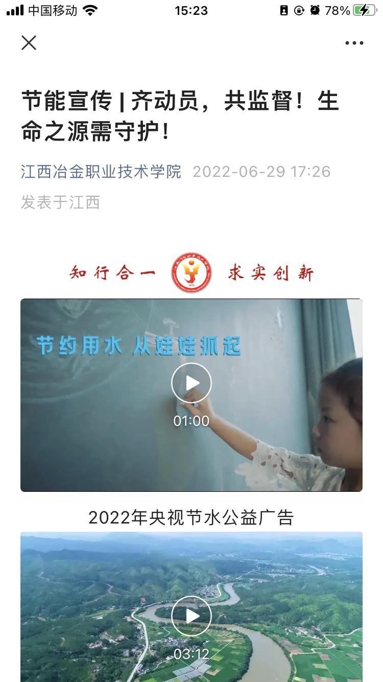 1、通过学院微信公众号,向全体师生推送节水宣传海报、《公民节约用水行为规范》主题视频、全国节水主题歌曲《节水中国》MV等宣传材料。