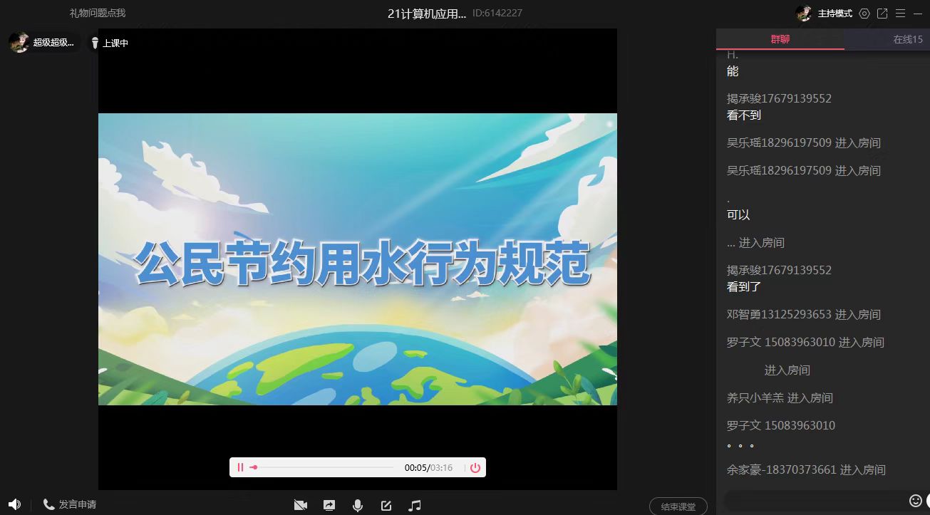 线上主题班会以观看节水宣传海报、《公民节约用水行为规范》主题视频、全国节水主题歌曲《节水中国》MV等宣传材料的形式开展。辅导员向同学们介绍世界水日和中国水周的来历,阐述我国水资源现状,讲述保护水资源的重要性,加强同学们对节水护水的认识。