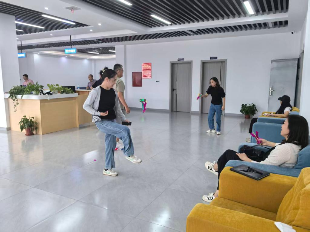 活动中,老师们屏息凝神,灵活调整步伐,彩色的毽子在脚尖轻盈跳跃,宛如一只只灵动的蝴蝶。参与的教职工纷纷点赞鼓励,在轻松愉快的氛围中增进着同事情谊。