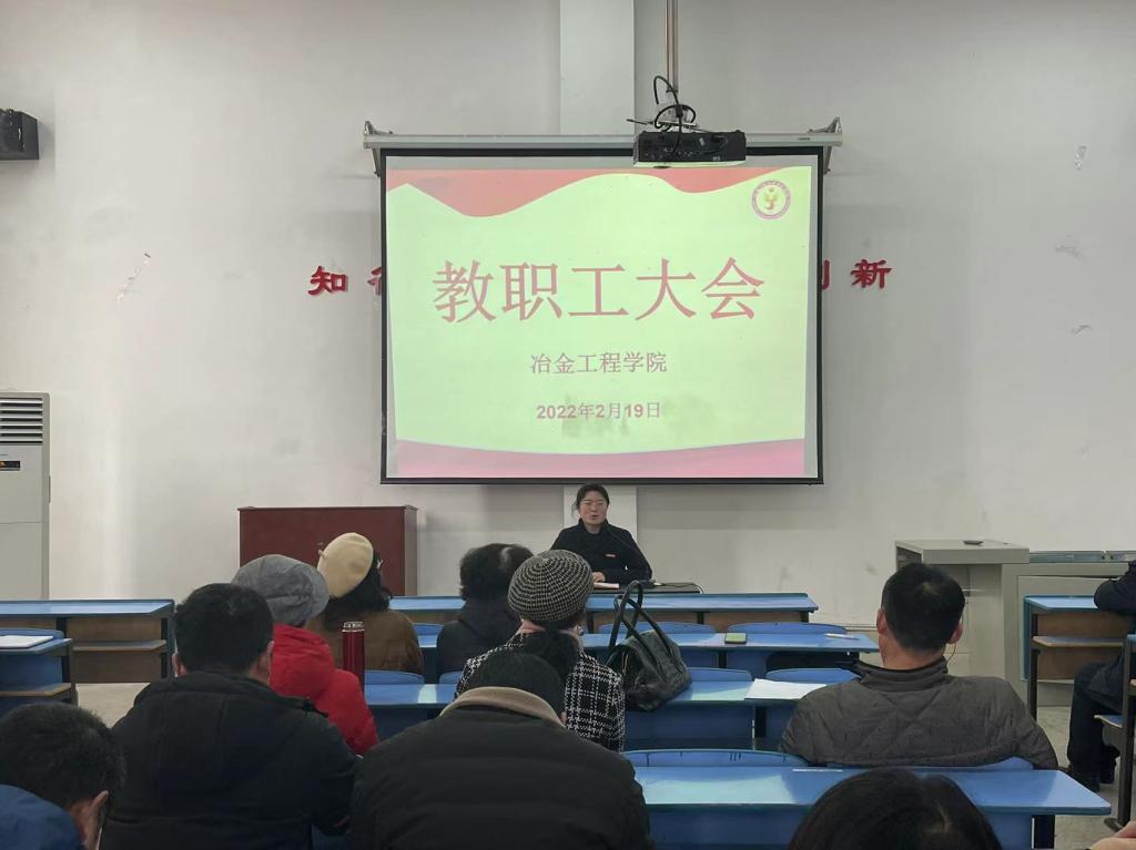 2022年2月19日上午9:00,在新一教301教室召开冶金工程学院教职工大会,会议由分院副院长曾伟勇主持,分院副院长兼党支部副书记万美茜出席,全体教职工参加。