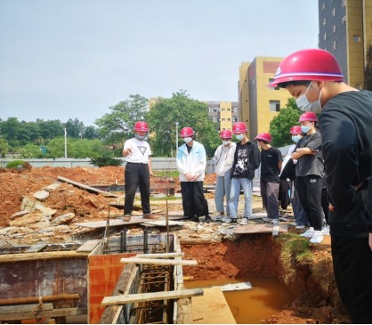 2022年5月17日上午,冶金工程学院20建筑工程施工班30余名中职学生在徐辉老师、杨志伟老师带领下,前往学院老校区建设工地参观学习,了解老校区临时钢构实训中心工程的相关情况,并开展《建筑施工技术》现场教学活动。