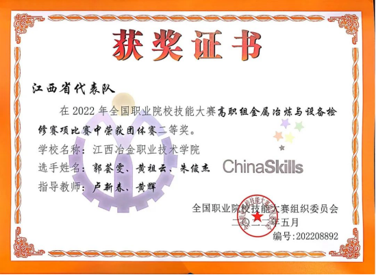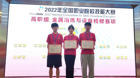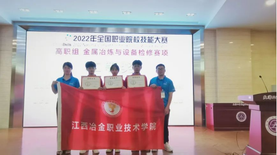 8月20日,2022年全国职业院校技能大赛“金属冶炼与设备检修”赛项(高职组)在天津工业职业学院圆满落幕。由beat365英国官方网站万美茜(领队)、卢新春(指导老师)、黄辉(指导老师)组成教师团队,郭荟雯、朱俊杰、黄祖云三名学生组成选手团队,代表江西省参加比赛,以优异成绩荣获项目国赛二等奖(全国第5名)。