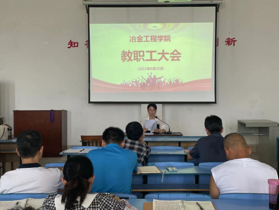 2022年8月25日下午,冶金工程学院在新一教301教室召开新学期教职工大会。会议由分院院长曾伟勇主持,党支部副书记、副院长万美茜出席,全体教职工参加。